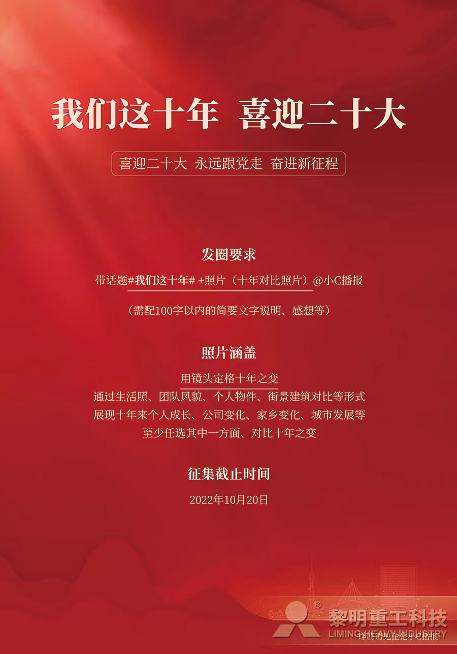 黨的二十大是在關(guān)鍵時(shí)期召開(kāi)的關(guān)鍵會(huì)議,習(xí)近平總書記的講話是我們邁上全面建設(shè)社會(huì)主義現(xiàn)代化國(guó)家新征程、向第二個(gè)百年奮斗目標(biāo)進(jìn)軍的前進(jìn)引領(lǐng)。開(kāi)幕會(huì)結(jié)束后,黎明重工黨委積極響應(yīng)上級(jí)黨組織號(hào)召,在企業(yè)內(nèi)部掀起學(xué)習(xí)貫徹黨的二十大精神熱潮:動(dòng)員全體黨員從自身角度出發(fā),發(fā)表對(duì)二十大報(bào)告的學(xué)習(xí)心得、反向反應(yīng),要求黨員把思想和行動(dòng)統(tǒng)一到二十大精神上來(lái),矢志不渝、篤行不怠,踔厲奮發(fā)、勇毅前行;在企業(yè)內(nèi)部發(fā)起“我們這十年,喜迎二十大”互動(dòng)討論,組織黨員和群眾以個(gè)人視角感知并記錄十年來(lái),個(gè)人、企業(yè)、家鄉(xiāng)或者國(guó)家的變化,以此激勵(lì)大家不忘初心、肩負(fù)責(zé)任、踐行使命;同時(shí),在二十大召開(kāi)前夕,發(fā)動(dòng)各位黨員拍照打卡,送出對(duì)黨和國(guó)家的殷殷祝福,并以此為動(dòng)力,以更飽滿的熱情投入新階段工作。