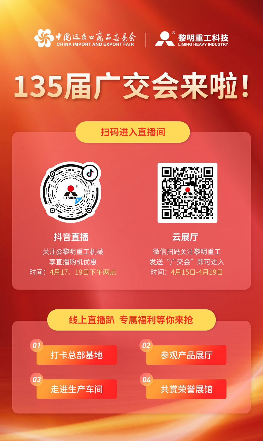 4月15日-19日,登陸黎明重工專屬的云展廳全方位地欣賞我們的產(chǎn)品,4月17日、4月19日下午2點(diǎn)抖音直播,15-19日廣交會(huì)全程每日直播,掃描上方二維碼關(guān)注我們,廣交會(huì)與您全線交流,敬請(qǐng)期待!