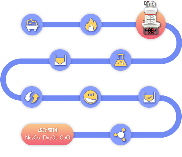 釹鐵硼廢料通過皮帶給料機(jī)進(jìn)入歐版磨進(jìn)行粉磨,粉磨后的物料經(jīng)過風(fēng)力作用通過選粉機(jī)進(jìn)行分選,選出符合要求的成品粉,通過旋風(fēng)收集器進(jìn)行收集暫存。