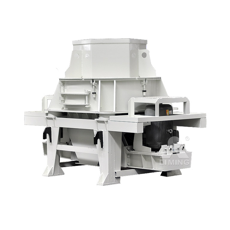 物料由進(jìn)料斗進(jìn)入制砂機(jī),經(jīng)分料器將物料分成兩部分,一部分由分料器中間進(jìn)入高速旋轉(zhuǎn)的葉輪中,在葉輪內(nèi)被迅速加速,其加速度可達(dá)數(shù)百倍重力加速度,然后以60-70米/秒的速度從葉輪三個(gè)均布的流道內(nèi)拋射出去,首先同由分料器四周自收落下的一部分物料沖擊破碎,然后一起沖擊到渦支腔內(nèi)物料襯層上,被物料襯層反彈,斜向上沖擊到渦動(dòng)腔的頂部,又改變其運(yùn)動(dòng)方向,偏轉(zhuǎn)向下運(yùn)動(dòng),從葉輪流道發(fā)射出來的物料形成連續(xù)的物料幕。這樣一塊物料在渦動(dòng)破碎腔內(nèi)受到兩次以至多次幾率撞擊、磨擦和研磨破碎作用,被破碎的物料由下部排料口排出。